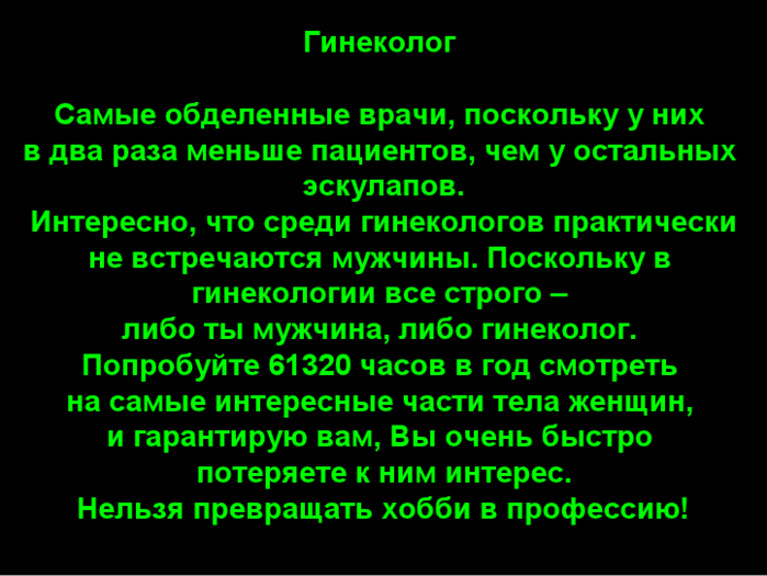 Нафиг надо....ПОВАР, ПЕКАРЬ, СТОМАТОЛОГ и ГИНЕКОЛОГ - эти люди у меня в чёрном списке....Ну, вот... Самых лучших мужчин в черный список внесла...
