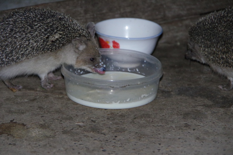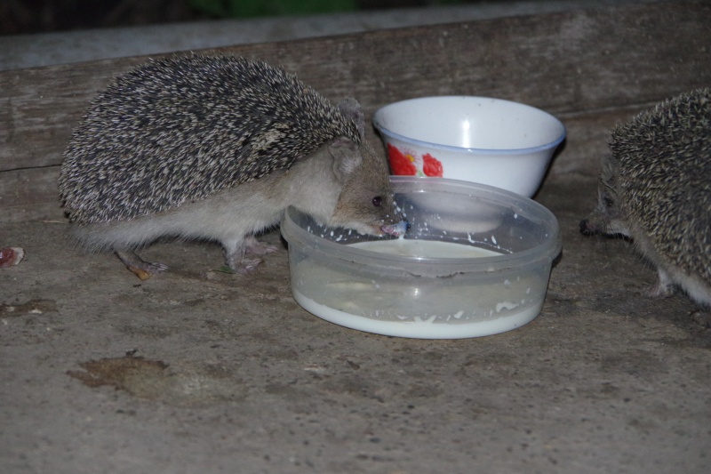 О, смотрите, нашла прошлогодних ежиков. Их там жила целая семья, они прикормились и приходили ужинать каждый вечер. Сначала обследовали кошачью миску, а потом уже за свой столик: очень сообразительные, сразу запомнили, где для них : )) А самый маленький вообще бесстрашный (потому что непуганый) и на ощупь мякушка в мешочке : )