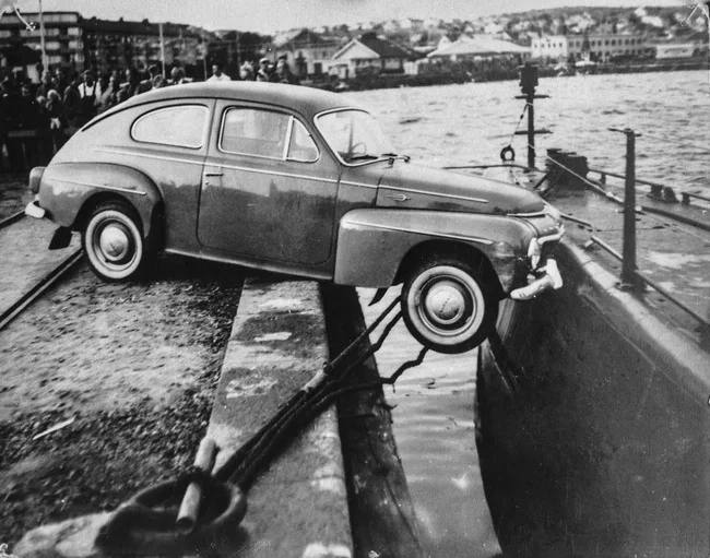 Эта авария произошла 19 августа 1961 года. Припаркованный неподалёку от набережной шведского портового города Люсечиль Volvo PV544 ни с того ни с сего снялся с тормоза и покатился вниз. В итоге шведский седан причалил прямо в шведскую подводную лодку Bavern (класс SSK Hajen).А жизнь длиннее не становится, и чё нам делать - застрелиться?