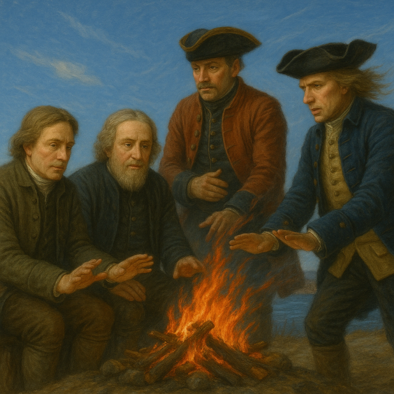 рисунок: доктор Мессершмидт, капитан Табберт и два пленных шведских корнета греются у костра на берегу реки Томи. Ветер северный сильный – развивает пламя костра. Ясно. Холодно.