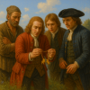 рисунок: Петер рассматривает, полученное от ишимского старателя драгоценное ожерелье, у коего спереди висели два маленьких медных льва, покрытых тонким слоем золота. Рядом с Петером фендрик Цоймерн и еще один пленный швед.. Ишимский мужик, сильно за 40, одет по погоде. Лето. Обь. Берег.