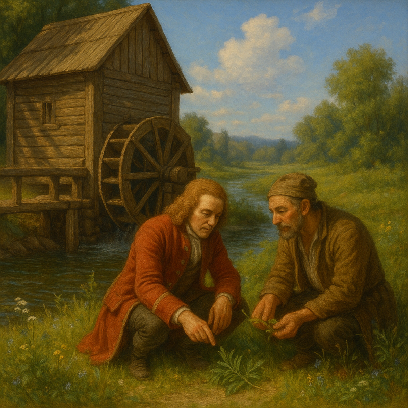 рисунок: доктор Мессершмидт и капитан Табберт дают указания двум девушкам-крестьянкам семена каких растений нужно собрать. Дело происходит недалеко от водяной мельницы на Черной речке – ее видно на заднем фоне. Ветер восточный. Солнечно.