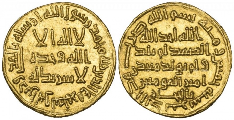 Такая надпись часто встречается на исламских монетах, особенно динариях, дирхемах и фальсах разных халифатов, начиная с Омейядов.