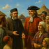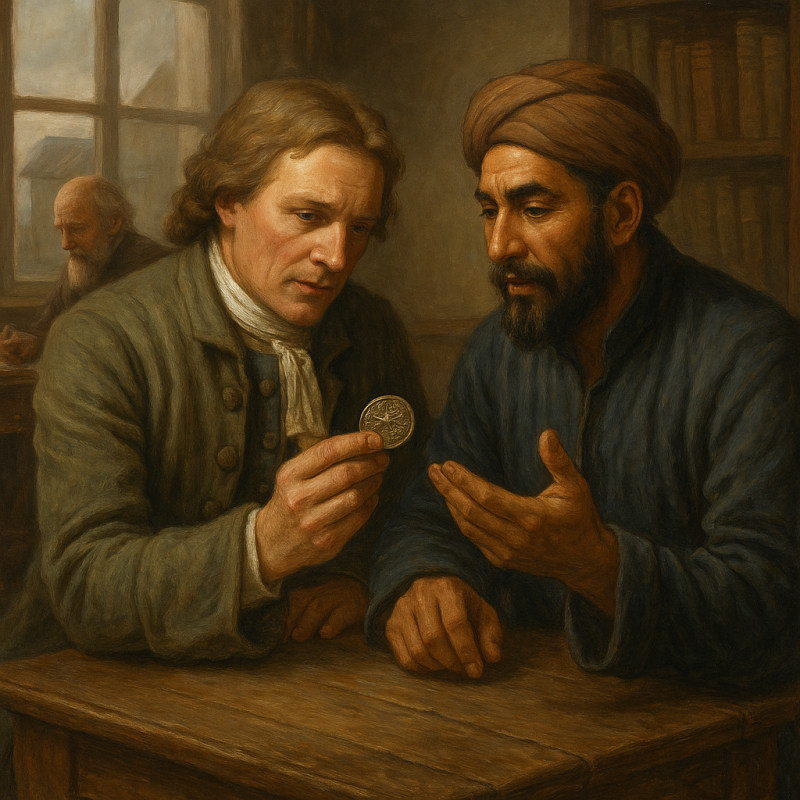 рисунок: капитан Табберт в резиденции доктора Мессершмидта рассматривает монету и слушает пояснения татарина.