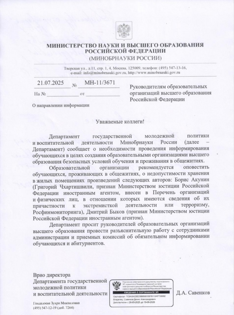 • «Распоряжение о запрете книг Акунина и Быкова в общежитиях оказалось фейковым»