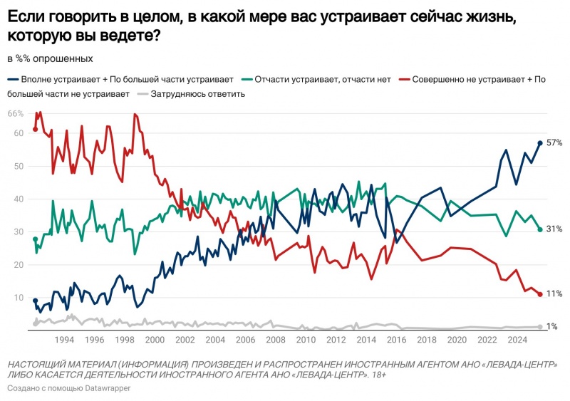 В июле 2025 года число удовлетворенных жизнью россиян составило 57%. Это самый высокий показатель с 1993 года, сообщил в соцсети X глава Российского фонда прямых инвестиций Кирилл Дмитриев, приводя результаты опроса.