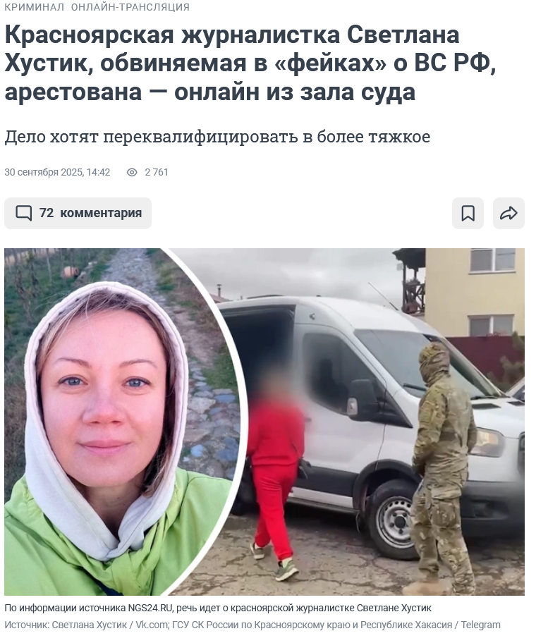 ну держи официальное СМИ, свежие новости - Красноярская журналистка Светлана Хустик, обвиняемая в «фейках» о ВС РФ, арестована — онлайн из зала суда. Дело хотят переквалифицировать в более тяжкое