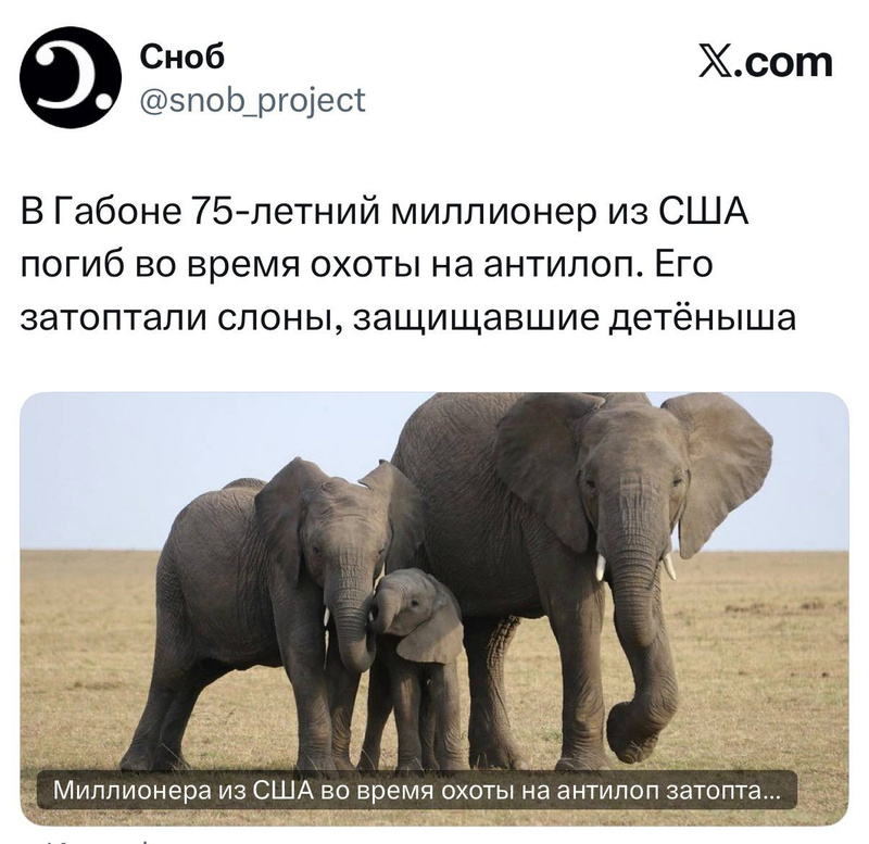 еще раз - мне все равно. убивал животных ради развлечения, слонам хвала. они его убили защищаясь.Он не охотился на слонов, наткнулся на них случайно. Ты отзеркаль ситуацию на своих родственников.