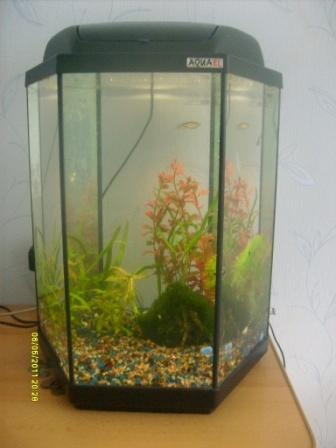 Аквариум номер 1: Aquael, ~ 60л., шестигранный, высота 51см. Население: данио- 3шт., креветки-вишни 10шт., улитки катушки.Растения живые (названий не знаю), + одно искусственное. Грунт искусственный. Фильтр внутренний с аэрацией. Свет 11Вт.