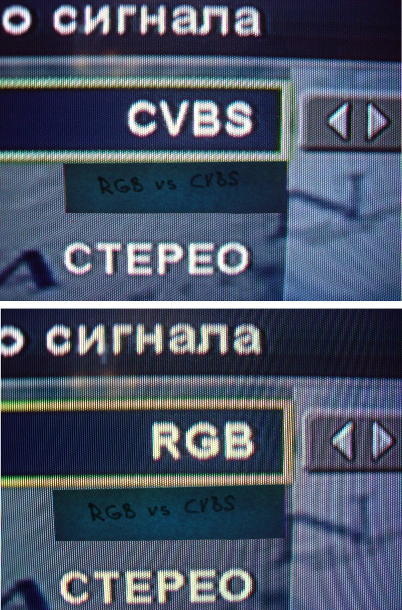 Обратите внимание на фото, заметна волнистая гребенка на желтой рамке. Также нечёткие контуры бывают на границах многих контрастных изображений. На динамичной картинке эти косяки по отдельности обычно незаметны, но в сумме всё это складывается в общий муар, снижающий чёткость изображения (переключая тип выхода на живой картинке, это отчётливо видно, но на фото я, конечно, этого передать не могу). Увеличьте фото, видно как размазаны пиксели экрана. Также картинка на CVBS более блёклая, чем на RGB (на моих фото это хорошо видно на примере той же жёлтой рамки).