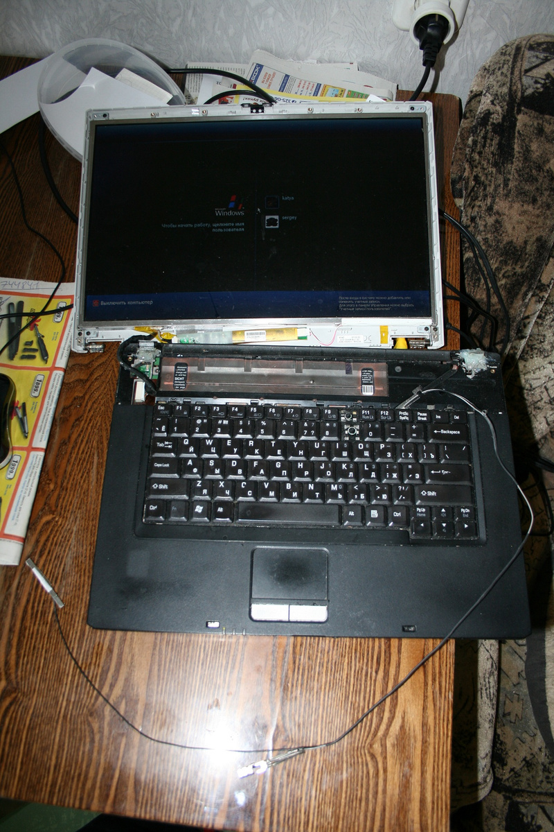 Проблема в том что ноут выглядить примерно как на картинке. Со временем сломались детали крепления экрана я пытался сделать какой то постамент или заклеить ( на фотках там клей поксипол ).