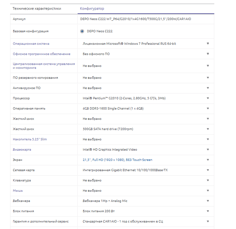 А вы только Depo рассматриваете, или взяли их, потому что на сайте есть калькулятор? Потому что за те же ~40 тыр можно получить больше: eVolution i780, intel Core i7-4770, 3400 МГц, 8 Гб, 1000 Гб, No DVD, Без ОС или или моноблок: eVolution g621 21,5 дюйма, Core i3, 3300 МГц, 8 Гб, 500 Гб, Без ОС У остальных просто надо переписываться с продажниками, получать ком.предложения и т.д.Ребят, я уже писал, что нужен именно российский производитель. Про мониторы сейчас согласовывается на более высоком уровне. если разрешат брать не российские, то вариантов будет больше, в том числе и по комплектации. Например неттопы там, а моники в другом месте. Если нет, то единственный выход - это моноблоки.