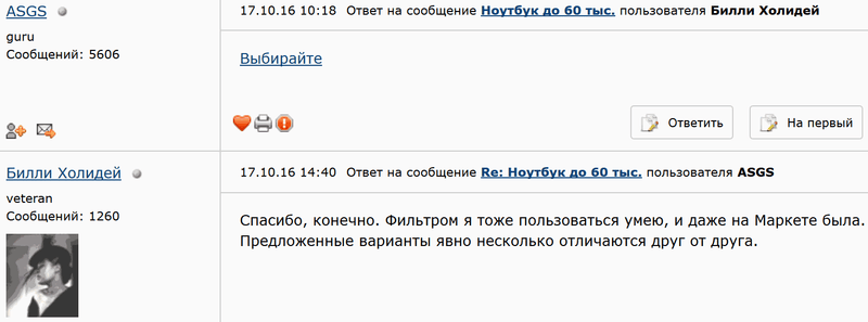 • Возможно мы друг-друга недопоняли. Сложение и вычитание, вот и все. Мы не знаем задач для бука - серфинг в инете или работа в маткаде и оцифровка видео, поэтому не можем сказать, какой проц ему будет лучше за ±2 тыщи и ±20% производительности. Потому и завел речь, что вот есть у нас бук за 60+, но, добавив буквально пару тыщ, мы можем получить прирост в производительности проца на 20%. А добавив ССД еще тыщи на три (утрированно) - поднять производительность дисковой подсистемы. И так далее до 120+ тыщ. Так же можно идти в обратную сторону - может человеку и i3 будет за глаза, и винт можно 500, и 4 гига хватит, и так далее - и взять недобук за 20-. Посему, считаю что варианты ТС представлены, а выбирать он будет дальше сам.