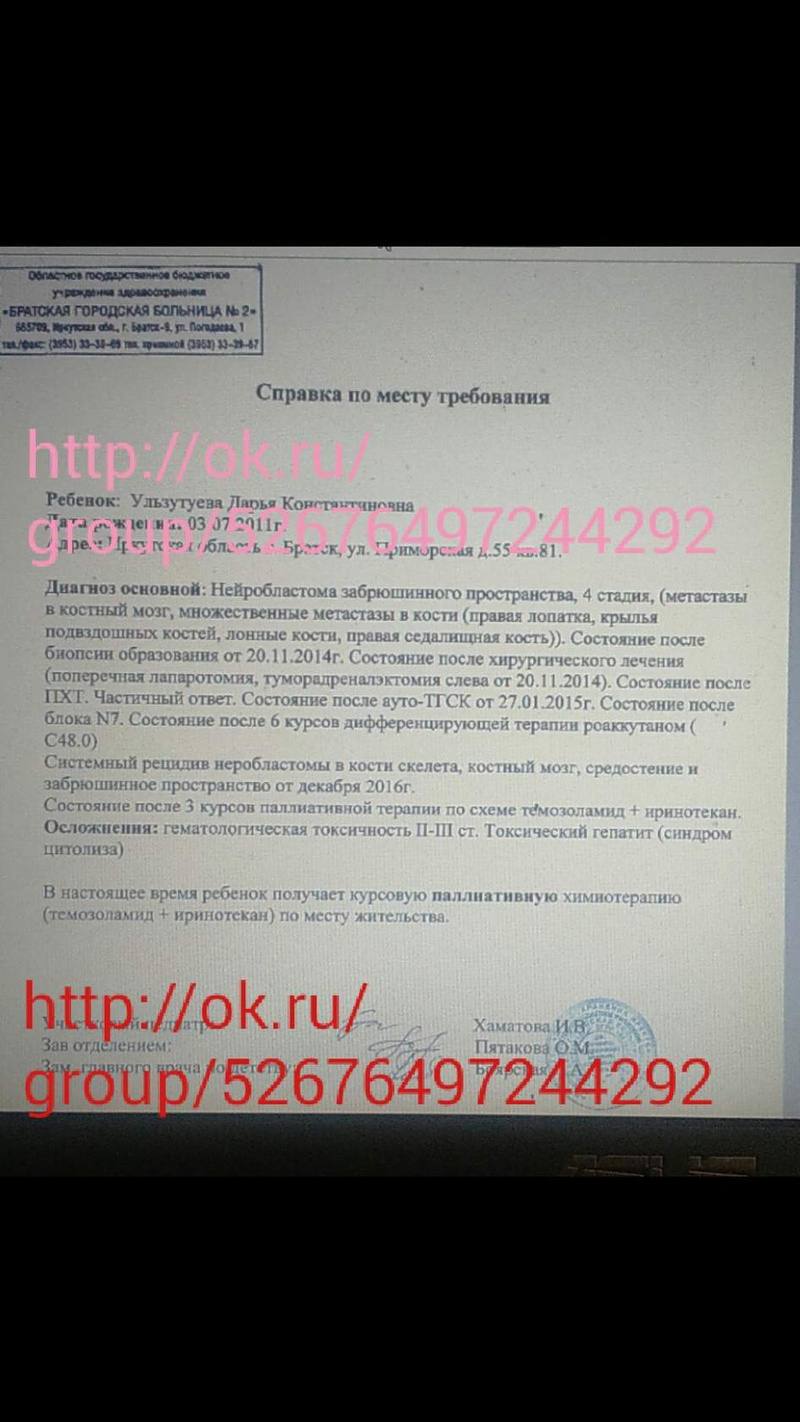 Ответ на сообщение Re: НУЖНА ВАША ПОМОЩЬ Даше Ультузуевой Нейробластома (рак) пользователя Eseniay