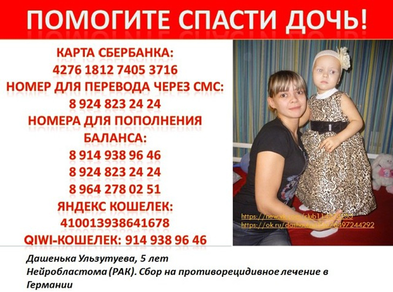 Чтобы помочь Даше, любой желающий может перечислить деньги на операцию по реквизитам или позвонить по телефону матери девочки.