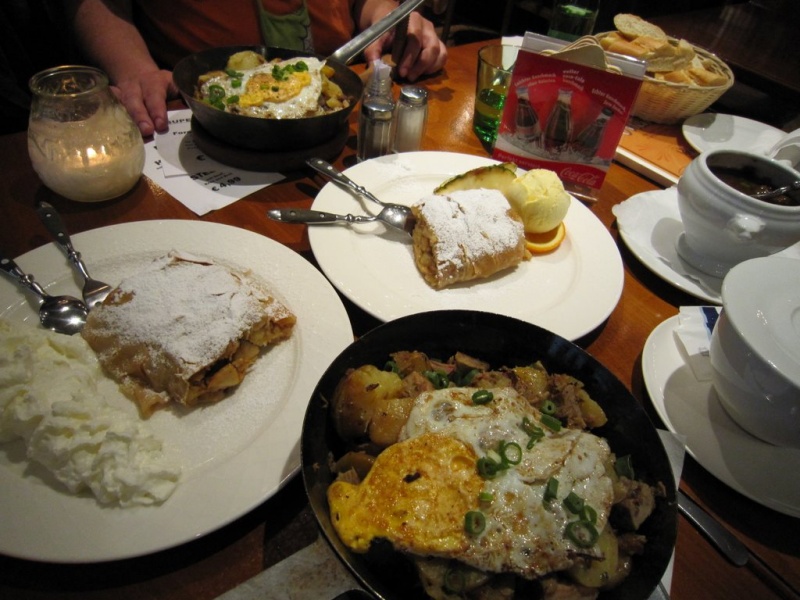 С кормежкой возникла классическая проблема- выбор :-) Зашли в симпатичное заведение- оказалась пивоварня. Заказали еду, штрудели там, какую-то сковородку. Девушки взяли пива- темного, пшеничного, нефильтрованного - а я решил воздержаться, ибо пускать второго пилота рулить через горы, ночью и под дождем- это было бы как-то неправильно. Разумеется, весь экипаж в один голос теперь утверждает что самое вкусное пиво было в Австрии :-)