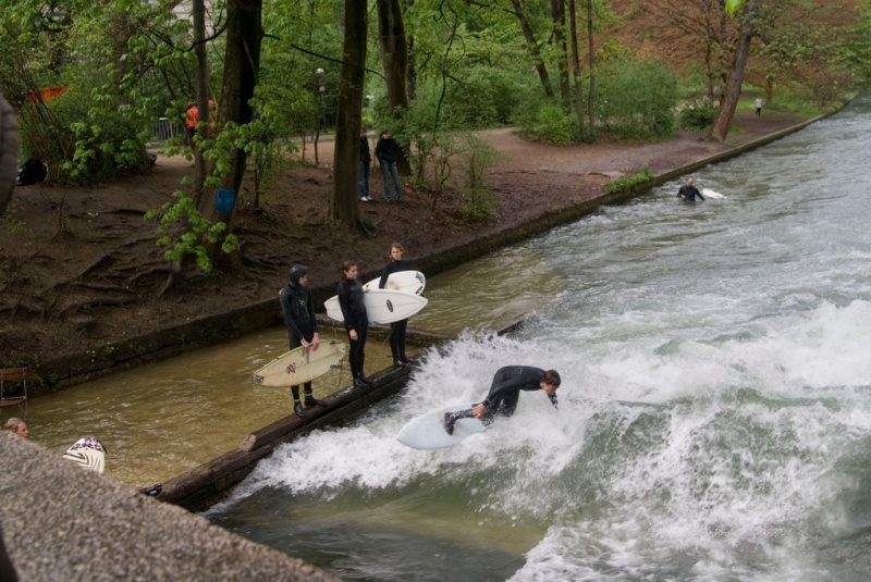 По пути увидел, наверное, самое неожиданное за всю поездку - а именно, сёрферов практически в центре Мюнхена! В канал с сильным течением опустили брезентовое полотнище поперек потока, и на образовавшемся завихрении катались на досках. Я, мягко говоря, охренел :-) Cудя по тому, что немцы, чтобы поглядеть на это чудо, массово перебегали дорогу в неположенном месте - сам чуть не задавил парочку,- не каждый день там такое.