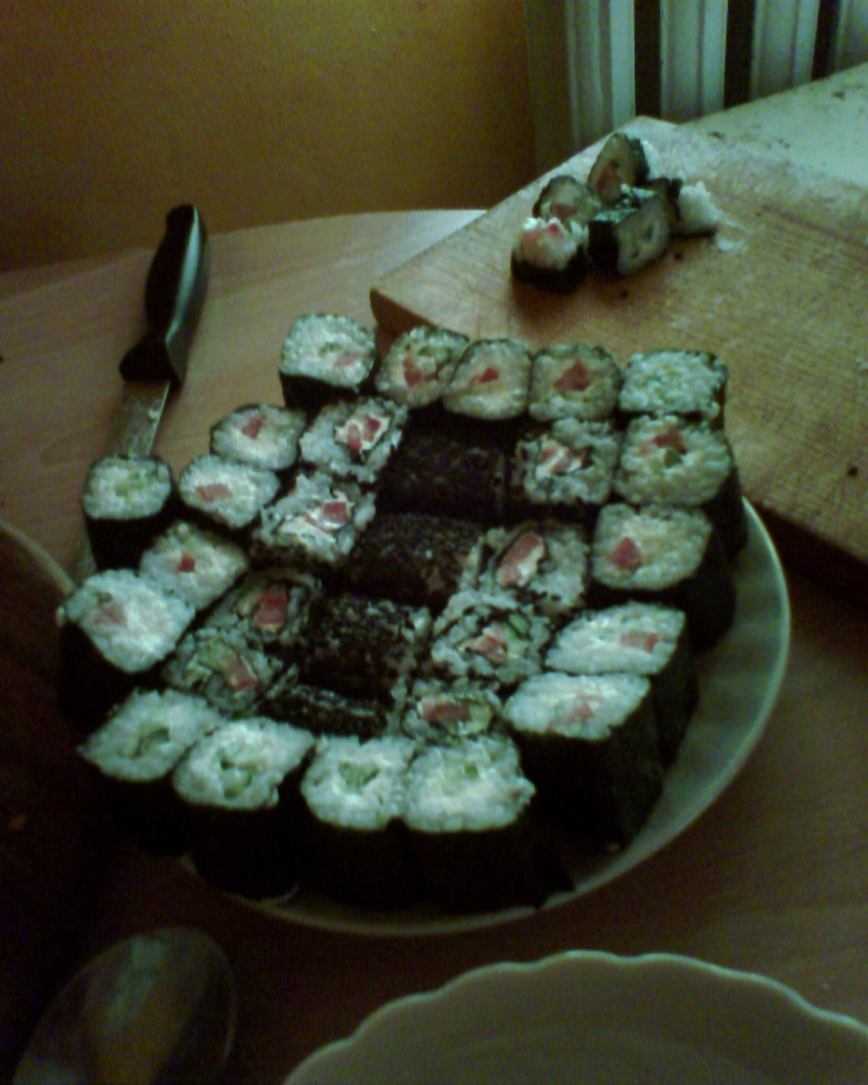 сушки были: с семгой, огурцом и сыром альметта (псевдоаналог филадельфии :))