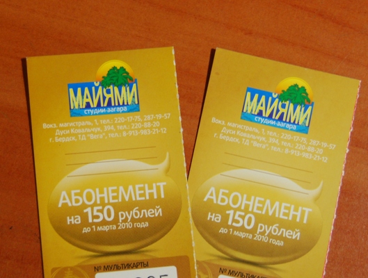 В ответ на: 2 абонемента в студию загара Майями стоимостью по 150 рэ, отдам оба за 200 рэ. Действует до 1го марта, кого заинтересует- вопросы в личку! Действуют до 1го марта! Торопитесь!=)