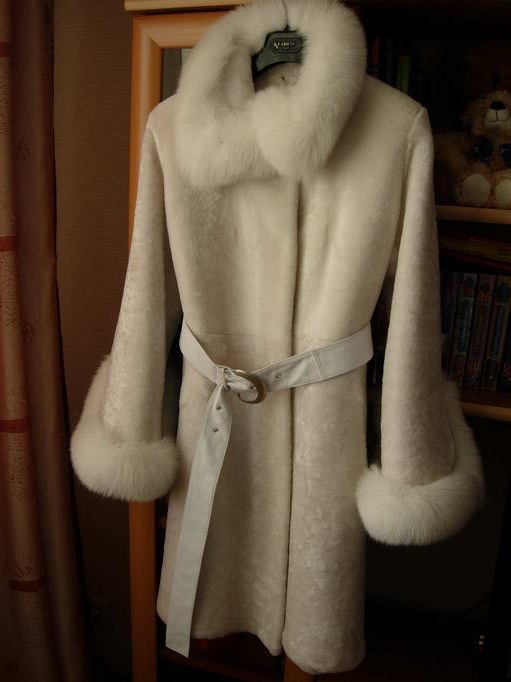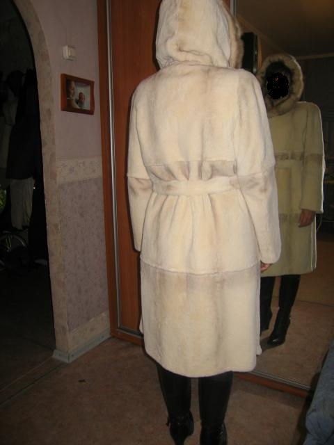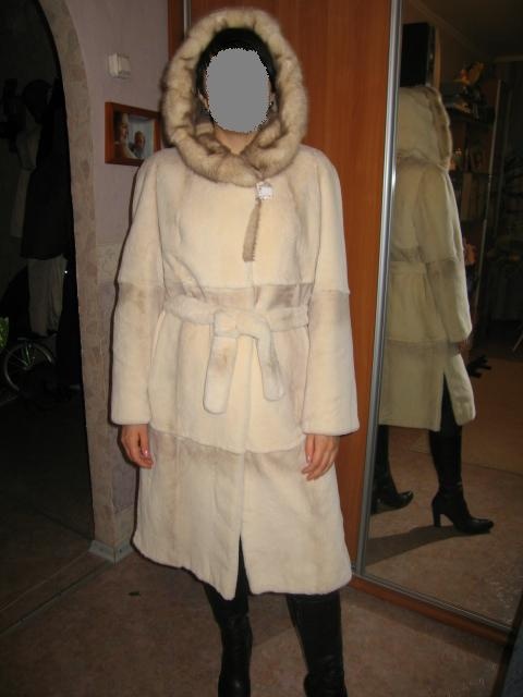Цвет молочный с серыми подпалинами. Двойной капюшон внутри отделан норкой. По бокам разрезы. Б/у пару раз "на выход".ICQ 474801241