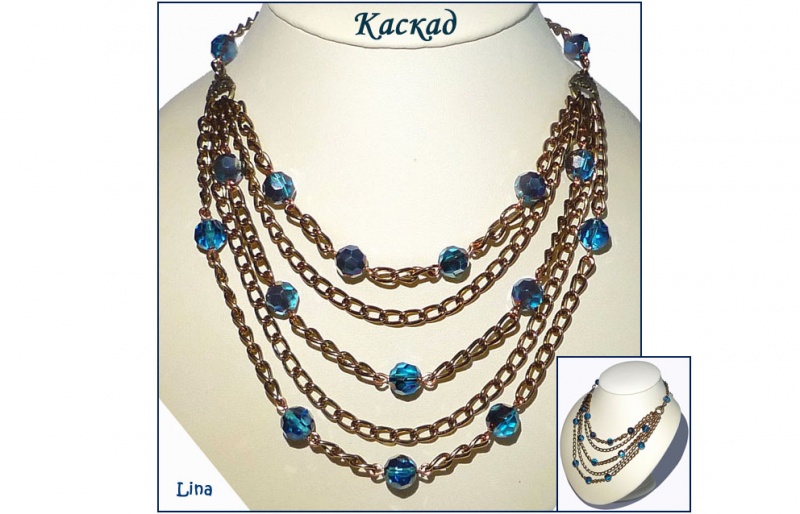 Цепочка цвета старого золота, чуть с медным оттенком. Бусины темно-синие, с односторонним радужным покрытием.