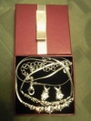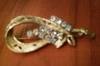 Извиняюсь...я про Ваш браслет хотела спросить!!!Вот такая брошка)Ни разу не надевала ее)Так что все стразики(голубенького цвета) на своем месте))Из белого металла?На фотографии очень плохо видно...есть другое фото браслета?