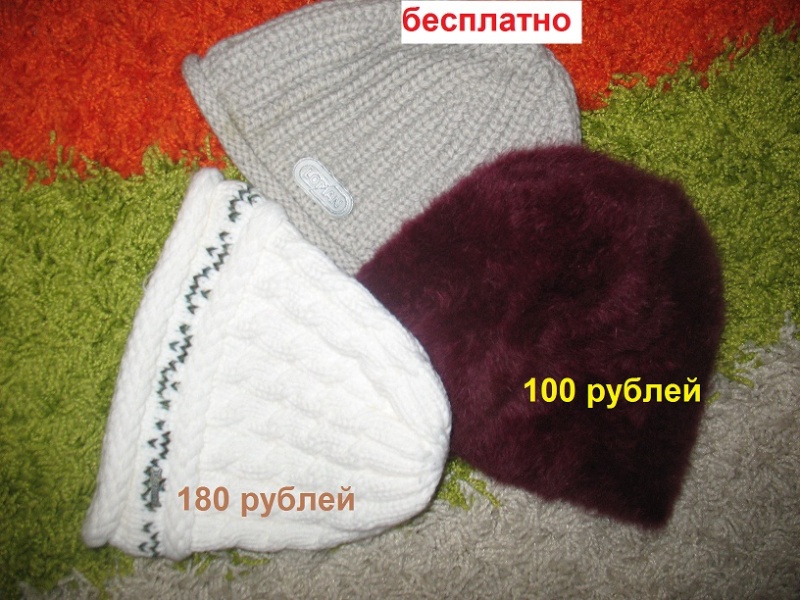 шапочки по 100, 180 и даром ! Были куплдены "про запас", ну не ношу я шапочки, даже зимой!!! белая с зеленым рисунком НОВАЯ , в реальности не смотрится "просто", имеет металлич. эмблемку сбоку, хорошо сидит, прекрасная фабричная вязка. 180 рублей. бордо- ангора , оч тепленькая, б/у 1 разочек, 100 рублей серенькая , даром