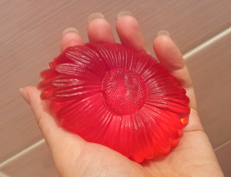 ). Достаётся из формы достаточно просто (делала в пластиковой форме мыло). Похоже на мармеладку, так и хочется откусить кусочек))) Такое мыло можно гнуть во все стороны и растягивать, оно будет вновь принимать свою первоначальную форму. Ещё его можно повесить на зеркало или на кафельную плитку - забавно, особенно детям понравится. Пенится очень хорошо, что для меня было неожиданно - думала, что пены будет намного меньше. Мне основа очень понравилась, буду экспериментировать с ней дальше