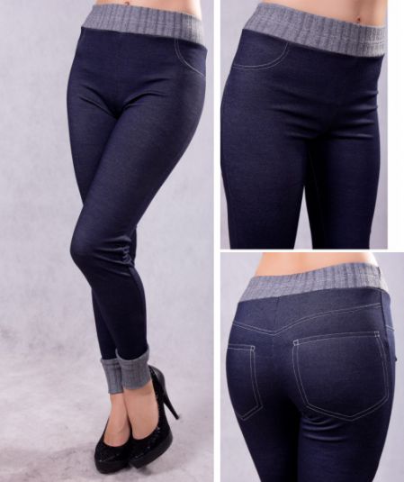 Легги. Описание: вискоза 95% эластан 5%.Теплые брюки- треггинсы из плотного трикотажного полотна с ворсом.Пояс изделия и манжеты низа брюв выполнены из полотна компаньона - "лапша". Задняя и передняя часть брюк украшены декоративной отстрочкой в виде карманов. Пояс на резинке. Цвет; синий, размер-46 (рост170; ОБ-100-104). Фтрма Wissel. Цена - 680 руб
