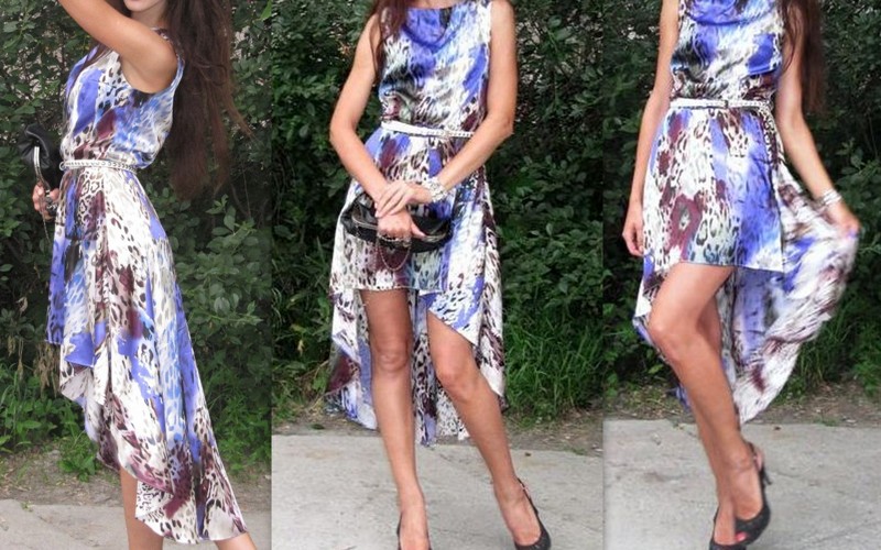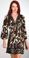 1. Hale Bob в коричневой гамме со змеиным принтом. Фирма, любимая многими голливудскими знаменитостями. В точно таком же платье была замечена модница Пэрис Хилтон. Крутая и самобытная вещица. Ткань - натуральный трикотажный плотный шелк. Отделана камушками по вырезу на гуди. Длина 90 см. Размер 44-46 наш. Модно поменьше, можно побольше. Это не летняя вещь, для теплого офиса сейчас - самое оно. Стоила более 350 долларов, в России уровень цен от 15 до 20 тысяч рублей за платье.