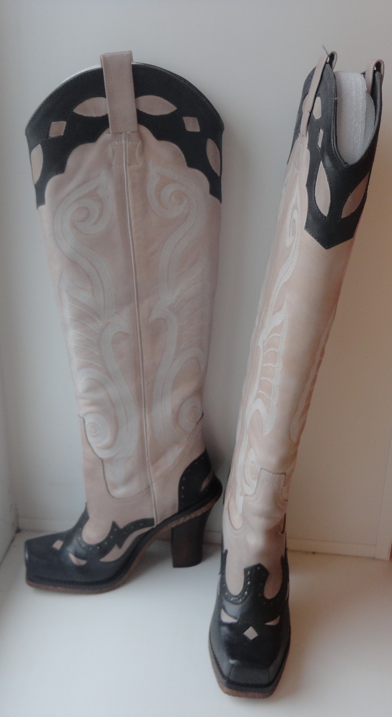 Роскошные сапоги в ковбойском стиле LISA FOR DONALD PLINER. Стоили больше 500 долларов. Люксовая обувь со всеми вытекающими: удобная колодка несмотря на высокий каблук, великолепный дизайн и безупречное исполнение. Без замка. Натуральная кожа, естественно. Размер 6М на 35-36 наш - в зависимости от ширины стопы.Выглядят изумительно! 5500