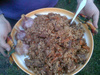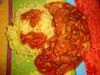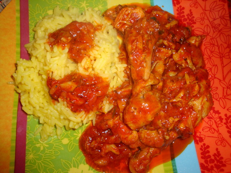 Цыпленка порубить, в кастрюлю с толстым дном - без масла! - бросить курицу, тушить на слабом огне под крышкой 15 минут. Потом добавить столовую ложку сливочного масла и нарезанный полукольцами лук, тушить минут 10. В ступке истолочь крупную морскую соль, перец горошком, чеснок и все специи. Добавить это все в цыпленка и туда же томатную пасту. Закрыть и тушить еще минут 30. Потом добавить горсть изрубленной петрушки (еще добавляют кинзу и базилик, но мы это не едим). Подавать с рисом, сваренным с шафраном.
