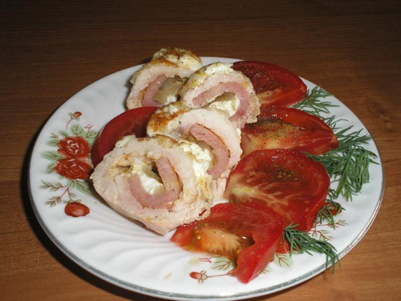 А как вариант начинки, ветчина с грибами, наверное, хорошо будет еще. Яйца, наверное, рубленные или вообще целые положить, на срезе красиво будет. А в фарш тогда петрушечки можно добавить.
