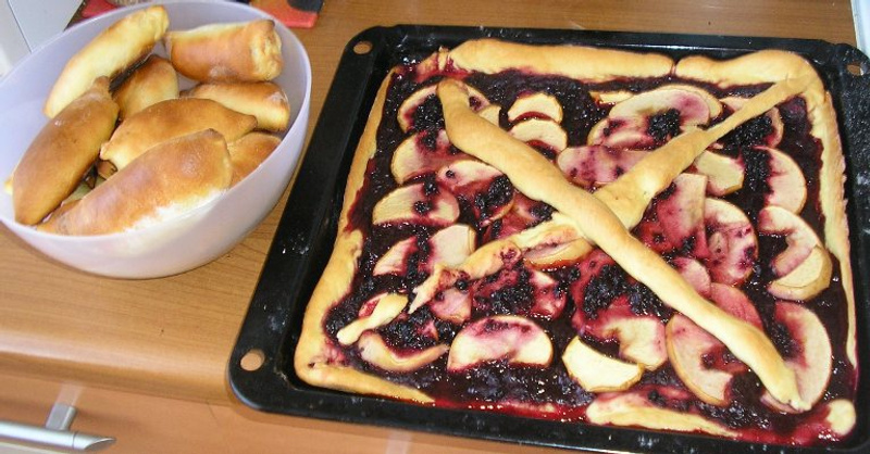 А это мои пирожки по такому рецепту. Начинка: сосиски (их муж любит), кортошка, капуста, ну, а большой брусника и яблоки, правда теста на косички не хватило. Тессто сделала вчера в 19:00, печь начала сегодня в 8:00! Вкусные, тесто чуть-чуть сдобное получается, хотя может и ошибаюсь давно печеных пирожков не ела! :). Спасибо за рецепт