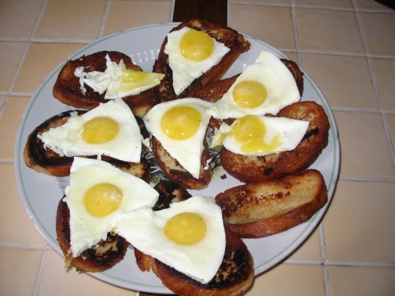 У моих любимый завтрак- обжаренные ломтики батона(вымоченные в молоке и посыпанные солью) а сверху по глазунье.вот и сегодня был такой завтрак