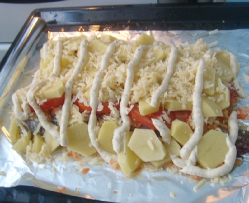 две тушки внизу, потом лук-морковка-помидоры-кортофель-сыр-соус