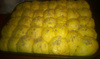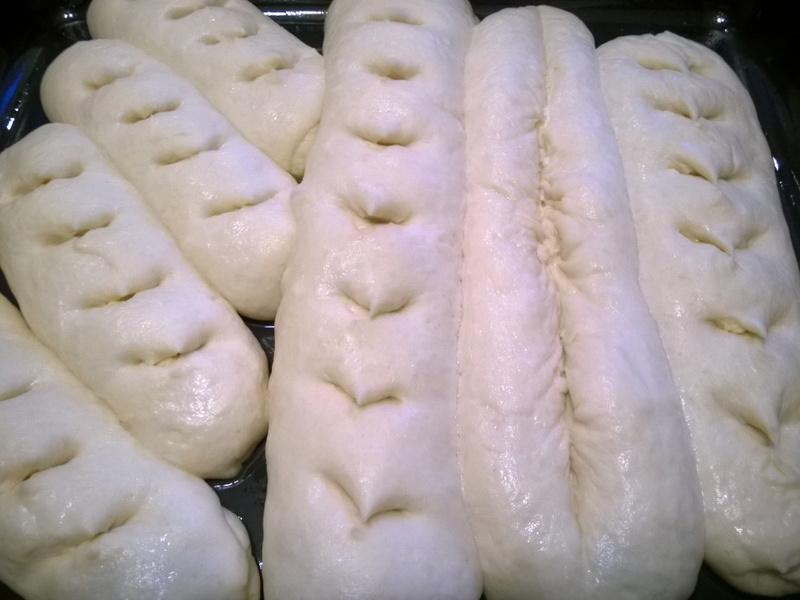 У меня получилось три длинных батона и 4 маленьких. Я раскатывала прямоугольники. Смазывала их сливочным маслом, смашанным с чесноком и немного соли и на первую половину пластины выкладывала сливочный сыр хохланд. Затем сворачивала плотненько сыром внутрь в рулетики и укладывала на лист швом вниз. У меня получились такие жгутики величиной чуть толше сосиски. Места между будушими багетами было много. И ничего не предвещало беды. Какого же было мое неприятное удивление, когда через 30 минут расстойки - они увеличились в размере почти в 4 раза и соединились в одну огромную булку. Все сбрызнула водой (не знаю зачем, но где то вычитала, что так надо)