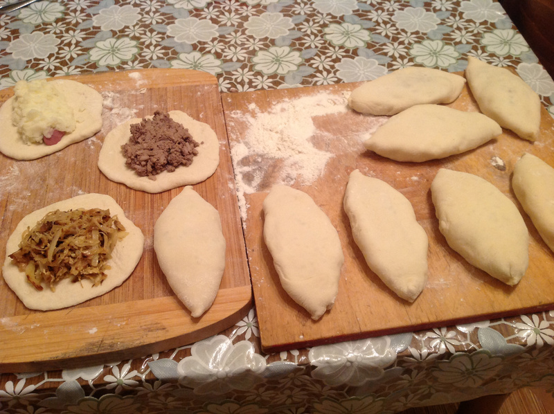 Тесто дрожжевое из магазина Писаревский хлеб, начинки: печень с рисом, капуста 50/50 квашеная и свежая, смешанная с яйцом, сосиски с картофельным пюре.