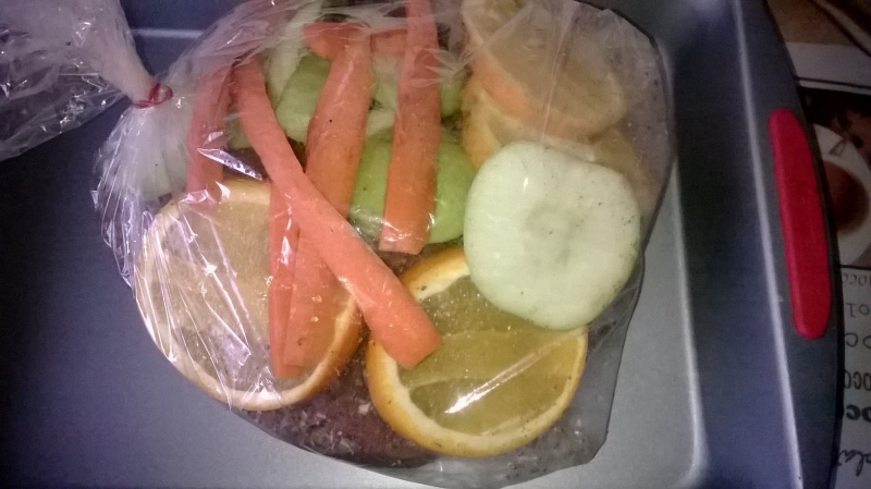 Окорок был на 1,5 кг, готовка длилась 7 часов при температуре 100 градусов.