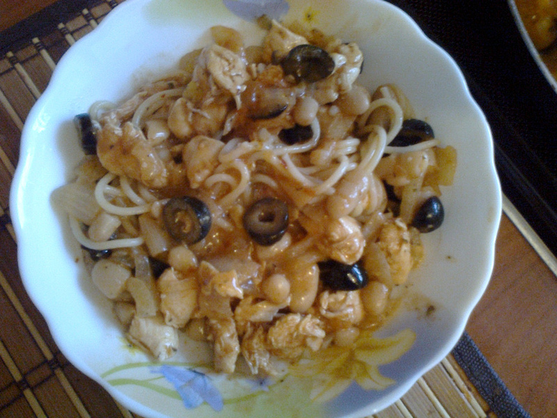 нужно: филе курицы/другое мясо, лук, маслины, фасоль, томатная паста,приправы- пряности+спагетти (всего на глаз, исходя из вашей кулинарной интуиции)))