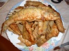 Красную рыбу ем только в солёном либо копчёном виде. В жареном мойва(как жарить уже писали) минтай и камбала. Из тресковых именно минтай считаю самым нормальным для жарки. Всё остальное(тресковые) либо слишком сухое, либо разваливается на сковородке превращаясь в кашу. Минтай режется на мелкие кусочки, примерно как выше есть фото, обваливается в муке, в которой намешана соль и перец. Важно укладывать на сковороду не на кожицу, а на разрез. Сразу же посыпаем мелко нарезанным луком. Важно подобрать такую температуру жарки, чтобы с одной стороны рыба жарилась а не тушилась, с другой стороны лук не успевал сгорать. если жарите в несколько заходов, то надо каждый раз лопаточкой снимать весь лук и добавлять растительное масло. Масла должно быть достаточно много - примерно слой миллиметра два-три. Рыба получается сочной и вкусной. Камбала жарится так-же, единственное её на разрез не уложить, поэтому не крупную тушку просто пополам. Есть ещё один рецепт с минтаем - пальчики оближешь(хотя лучше вилкой кушать ). Минтай можно крупными кусками, можно даже целиком(конечно почищенный) обваливается в муке и обжаривается. Здесь даже не важно будет он жариться или париться, главное довести до состояния когда легко снимается с костей. Потом мясо отделяется от костей, важно удалить все кости, делится на мелкие кусочки, можно прямо как спинка разваливается на кружочки, так и делить. Берётся морковка по весу и объёму примерно равной рыбе. натирается на мелкой тёрке, на сковороду выкладывается мелко порезанный лук, сверху морковка(чтобы лук успел поджариться до золотистого состояния), заливается растительное масло, затем тушится, добавляется томатная паста ложка-две(по вкусу), соль, чёрный перец. когда морковка начинает становиться мягкой добавляется рыба. всё перемешивается и доводится до готовности. Масла там должно быть достаточно много, примерно как в магазинах продают икру кабачковую или баклажанную в крупной нарезке. Это блюдо мне нравится в охлаждённом виде, из холодильника. можно делать как бутерброд на хлеб, можно с гарниром(гарнир горячий, морковка холодная).