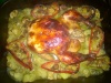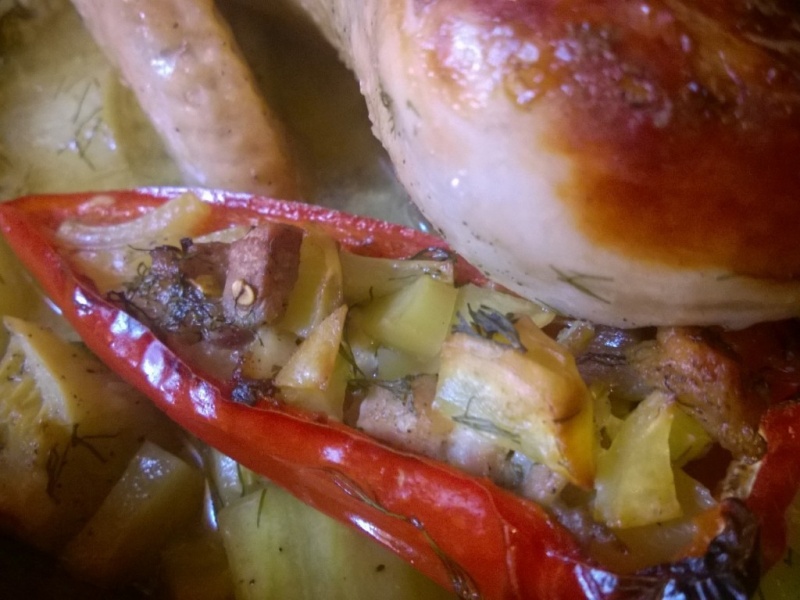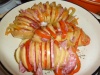 Берём клубень- режем тонко и не до конца.. - между пластиками бекон- но в этот раз у меня была армовирская колбаса копчёная., перец болгарский - на форму масло подсолнечное-с добавлением приправ. - помидоры, по вкусу - И в духовку. Если начнёт подгорать- сверху смачивать соком- так как у меня были помидоры_ сока хватило..Буду когда вернусь.