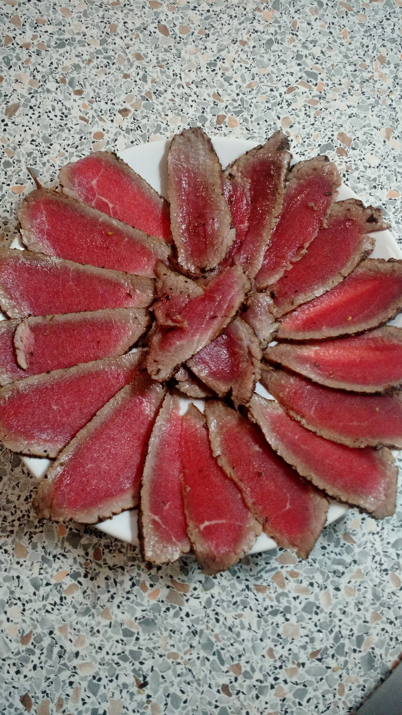 Это быстрый ростбиф у меня. Натертый солью и перцем, маслом и конечно обжаренный до корочки.. о это для меня "высшая" математика.. пойду по гуглю.. а то муж в камандтровку уехал- "но обещал вернуться".. надо удивить!