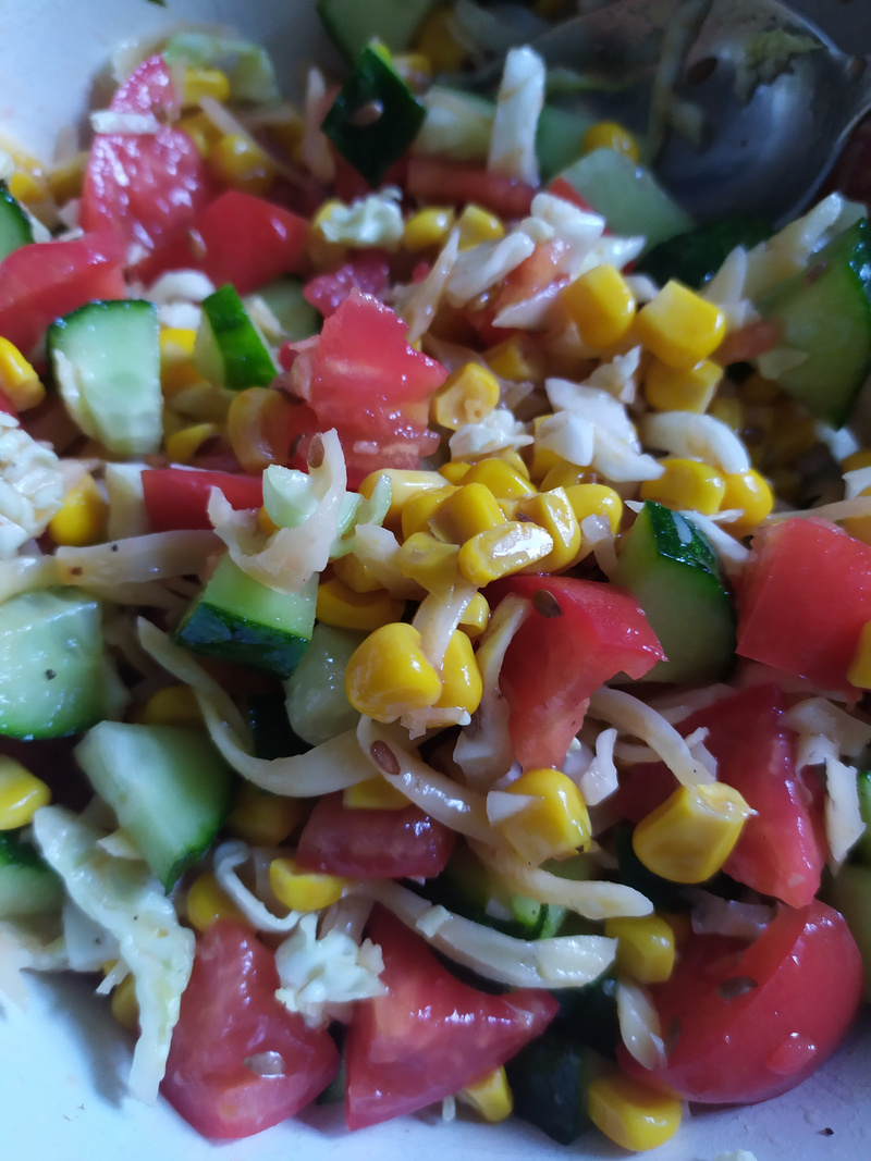 У меня снова салат был. И я уже заметила результаты таких своих ужинов, вес начал потихоньку уходить. Так что всем советую подобные блюда вечером. Салат не обязательно должен быть из одних овощей, если добавить в него немного тертого сыра или вареного куриного филе то он будет сытнее и гораздо дольше потом не будет хотется есть :)Салаты постоянно делаю. И не только на ужин. Когда еще их делать, если не в сезон овощей? Добавляю еще цельнозерновую пасту. Это вкусно и дает сытость, а на весе никак не сказывается.