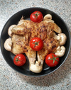 Цыпленок корнишон с фаршированными помидорами и шампиньонами.