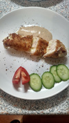 По идее надо полить соусом из грибов, сливок и соевого соуса, но обшелся французкой заправкой для салата. Лень было еще грибы мелко-мелко резать, тушить и соус готовить.