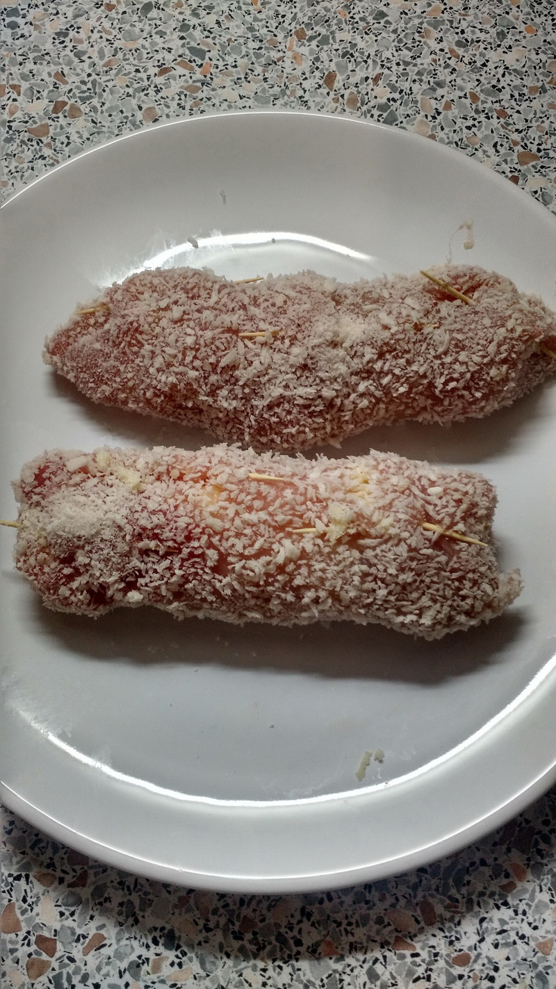 И творим куриный рулет с сулугуни. Все просто до безобразия. Грудку пополам, отбиваем в тонкую лепешку. Трем слугугни на терке, или в мясорубке. Заворачиваем все это, закалываем рулетик зубочистками, чтобы не распустился. Самый класс, когда зубочистки всего две, а то их потом на горячую надо выковыривать.