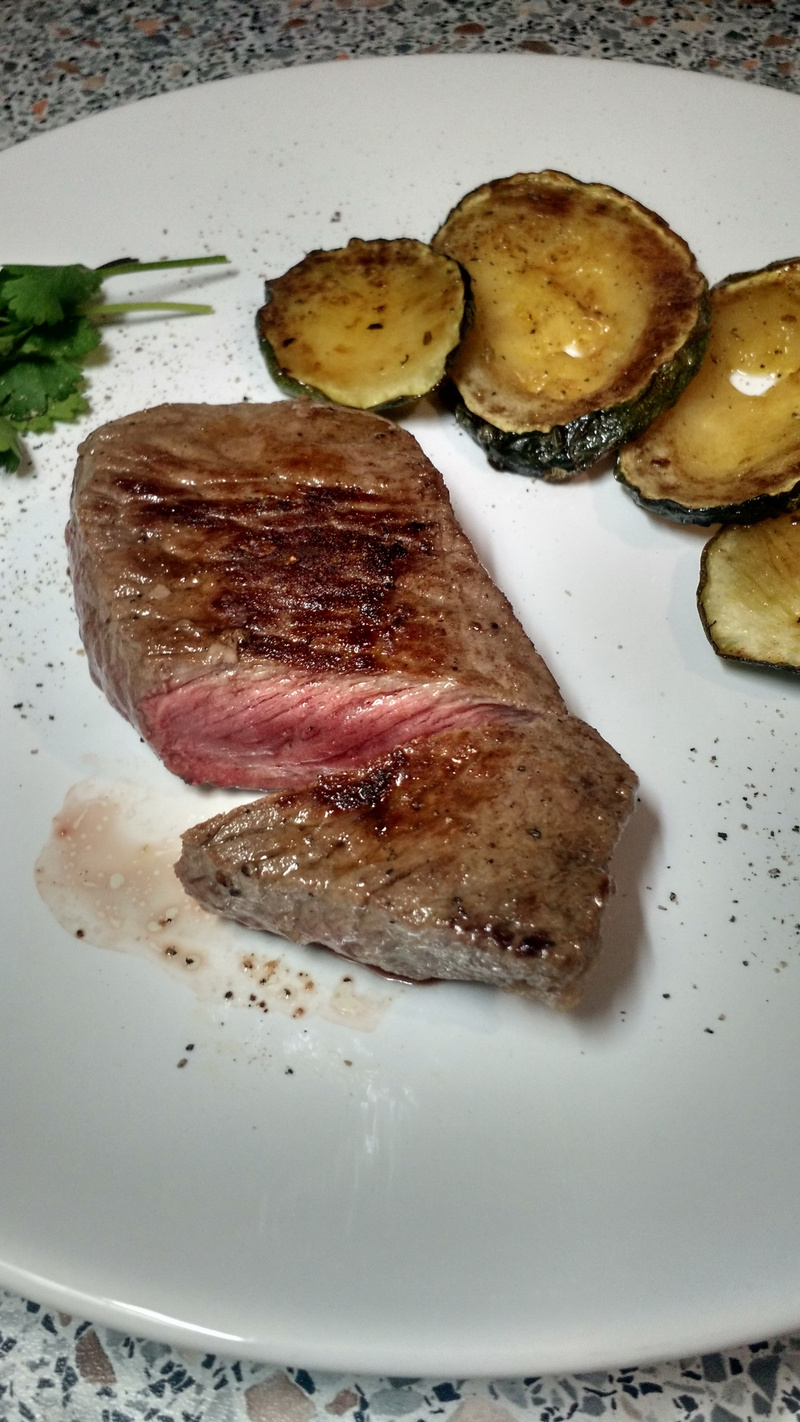 Снова стейк правильной прожарки.Подвох не ищу, но по мне мясного сока мало:))) Мне надо побольше, чтобы хлебом еще туда тыц!