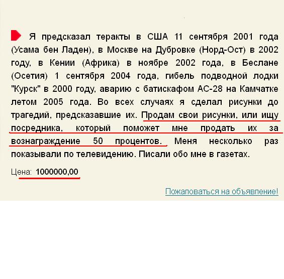Потом весной 2005 года я зачем то подал в газету ГОРЯЧИЕ ОБЪЯВЛЕНИЯ пять объявлений о знакомстве (достаточно одного объявления), где подписался: АМС-208, 101.202, тигр, Цельсий-20, Айсберг. А в конце лета 2005 года произошла серьезная авария с батискафом АС-28 на Камчатке, и тогда я понял, что опять предсказал событие.