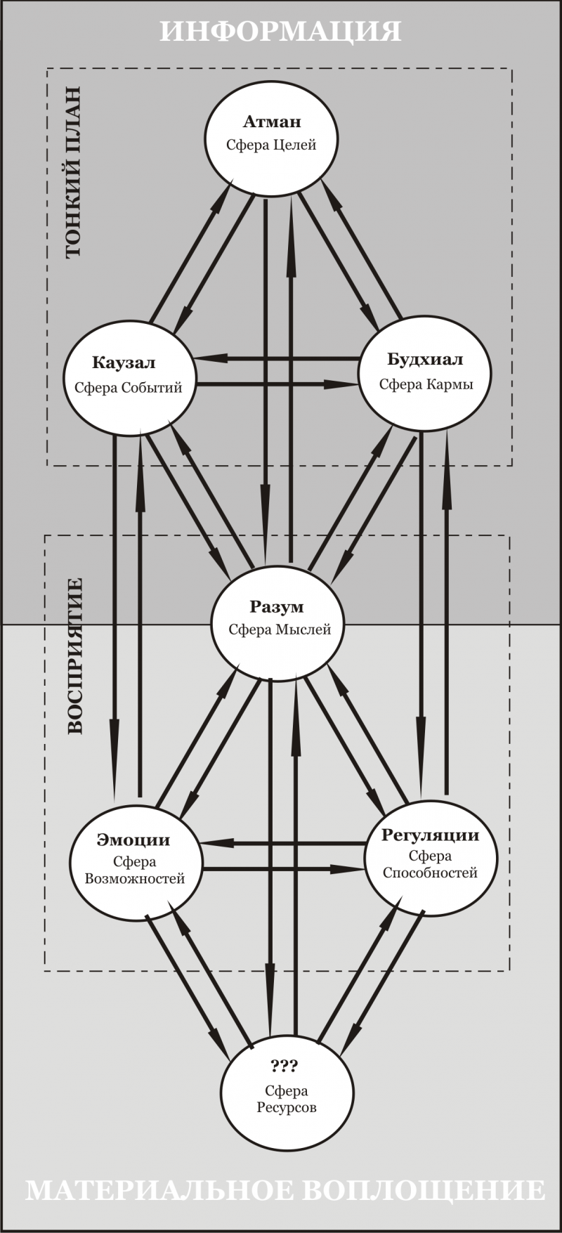 Систему связей между телами информационных систем мы будем представлять в виде единого поля, а не отдельных «проводов», соединяющих сферы. Поле связи тел – это целостный поток, пронизывающий всю систему. Сам по себе являясь волновой информационной системой, он позволяет тонким телам «общаться» между собой, предоставляя для этого собственные несущие частоты. Однако, подобно тому, как звук может быть разложен в спектр из семи нот, а свет – в спектр из семи цветов, мы попытаемся разложить в спектр поток связей между телами. Здесь нам более всего подойдет модель, предлагаемая восточной группой мировоззрений: модель системы чакр. В восточных мировоззрениях чакры ассоциированы с энергетическими каналами, обеспечивающими непосредственный обмен тела человека с макрокосмосом его материального мира. Мы воспользуемся этим представлением, имея в виду, что весь обмен между микрокосмосом и макрокосмосом осуществляется через информационную прослойку прототипов, и, помня о том, что информация является эквивалентом веществ и энергий. Чакра в нашем представлении – это определенная часть информационного спектра в системе связей между тонкими телами человека и макрокосмоса. Поэтому терминологическое соответствие понятий, приведенных ниже, аналогичных тем, что имеют употребление в учении йоги и каббалистических представлениях, весьма условное.